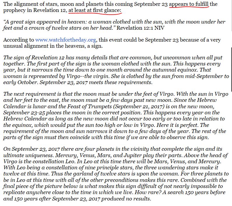 Next up we finally get into talking about the Rev12 Sign. According to the reports it will be YET ANOTHER "special alignment". His sarcasm is so thick you would think he is writing for a secular website doing a review about a failed sitcom starring Bill Cosby. I do admit you can poke fun at the countdowns found on the page he referenced. Countdowns only work for things like the launch of a NASA rocket and baking pumpkin pies (so I've heard anyways). Those things are at least under man's control. Biblical prophecies are under the sole control of Almighty God. All we can do is watch for them and respond when we see one.
